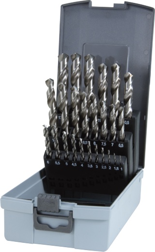 Bohrersatz aus 19 Spiralbohrern von Ø 1mm bis Ø 10mm, jeweils um 0,5mm steigend.