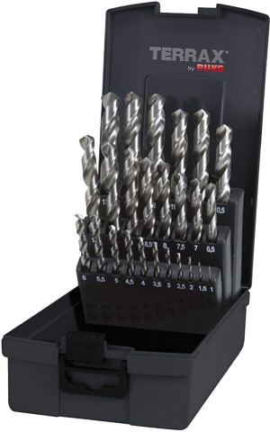 Bohrersatz aus 25 Spiralbohrern von Ø 1mm bis Ø 13mm, jeweils um 0,5mm steigend.
